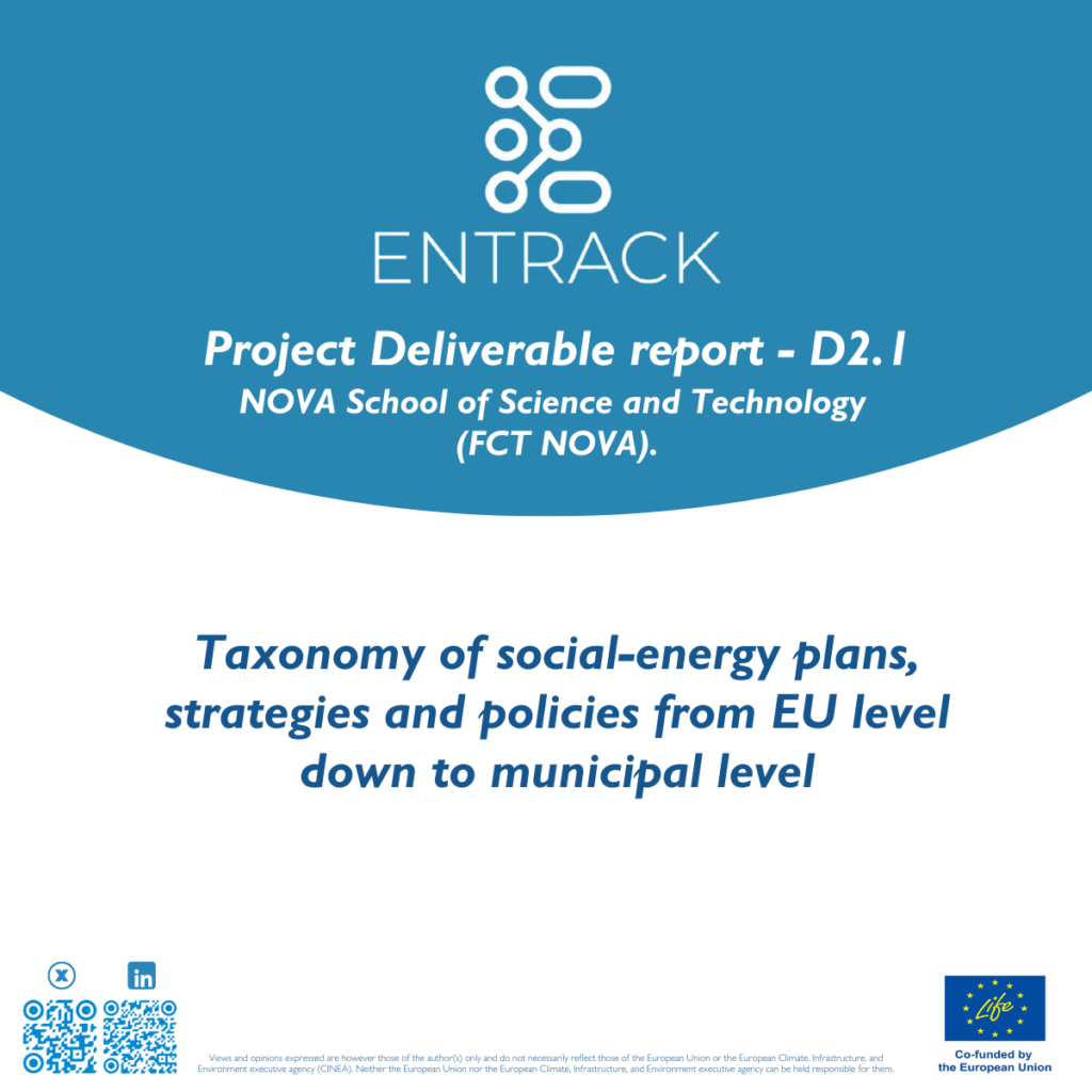The Taxonomy of Social Energy Plans, Strategies, and Policies report by the ENTRACK project looks at how energy policies are set at different levels, from the European Union to local towns and cities. It focuses on how these policies aim to fight climate change and promote sustainable energy use, especially in Southern Mediterranean countries like Portugal, Spain, Italy, and Greece. The report explains how global agreements like the Paris Agreement and the UN’s 2030 Sustainability Agenda shape local energy policies.